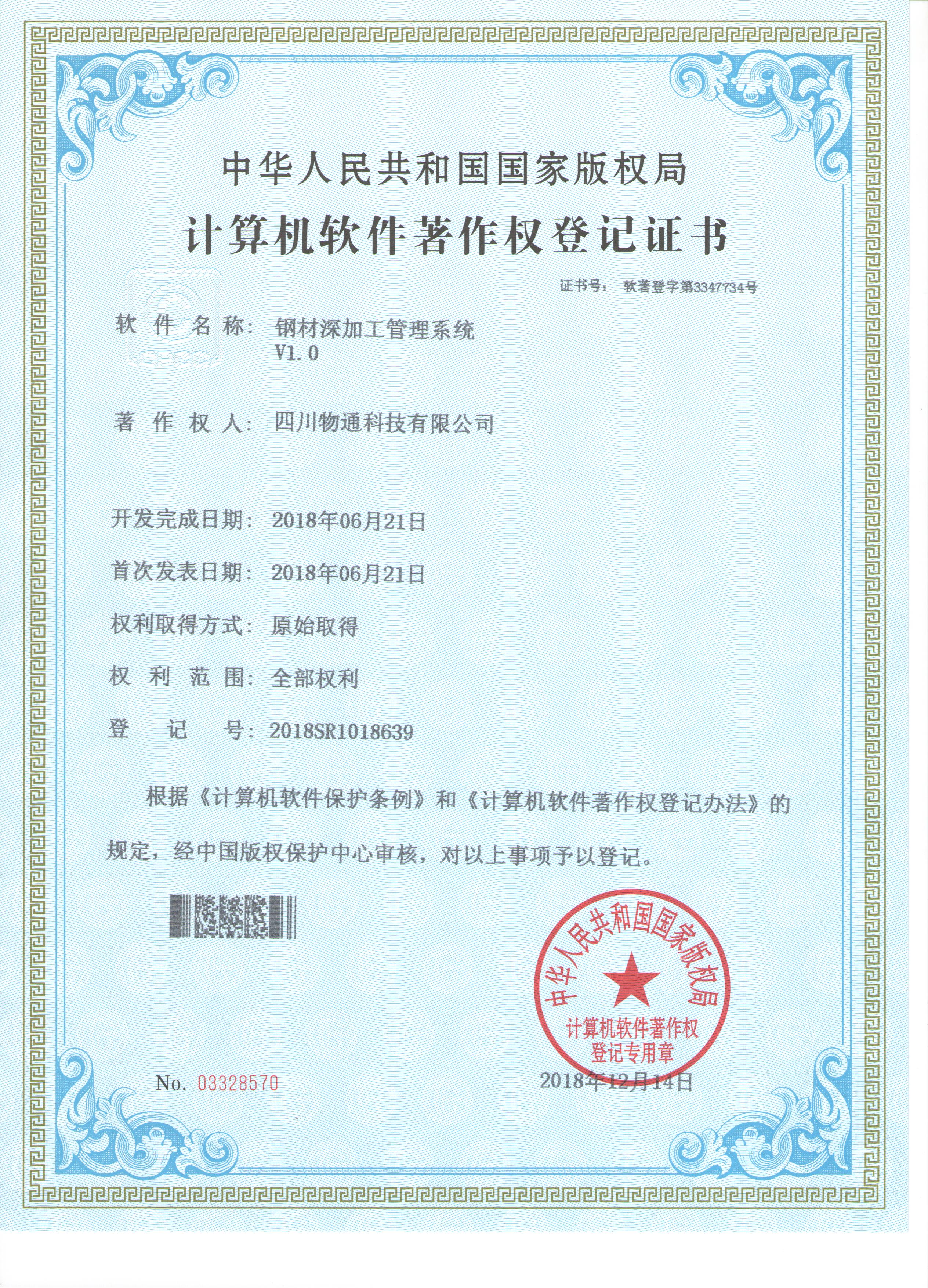 四川物通科技集團(tuán)有限公司技術(shù)部成功申請(qǐng)三項(xiàng)計(jì)算機(jī)軟件著作權(quán)登記證書:《鋼材深加工管理系統(tǒng)》、《基于客戶應(yīng)用信息處理技術(shù)的數(shù)字化倉(cāng)儲(chǔ)物流...